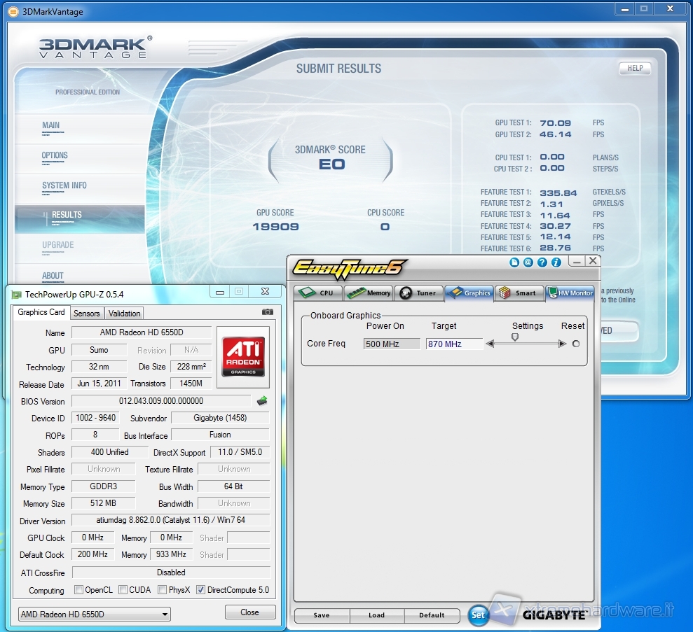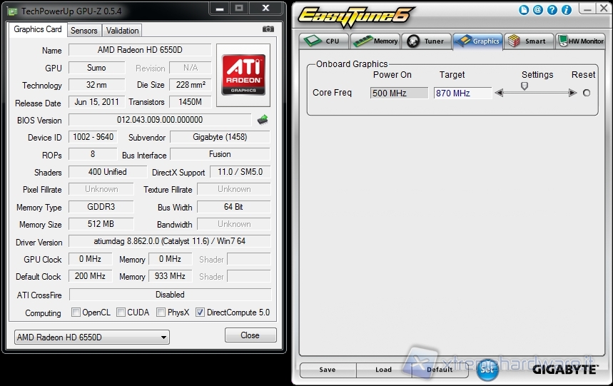 Dopo aver effettuato l’overclock sulla CPU abbiamo rimosso la Radeon HD 5450 dedicata e, una volta riportata la frequenza della CPU al valore di default, abbiamo effettuato l’overclock della GPU agendo solo sul valore della stessa, riuscendo a portare la frequenza a 870MHz.